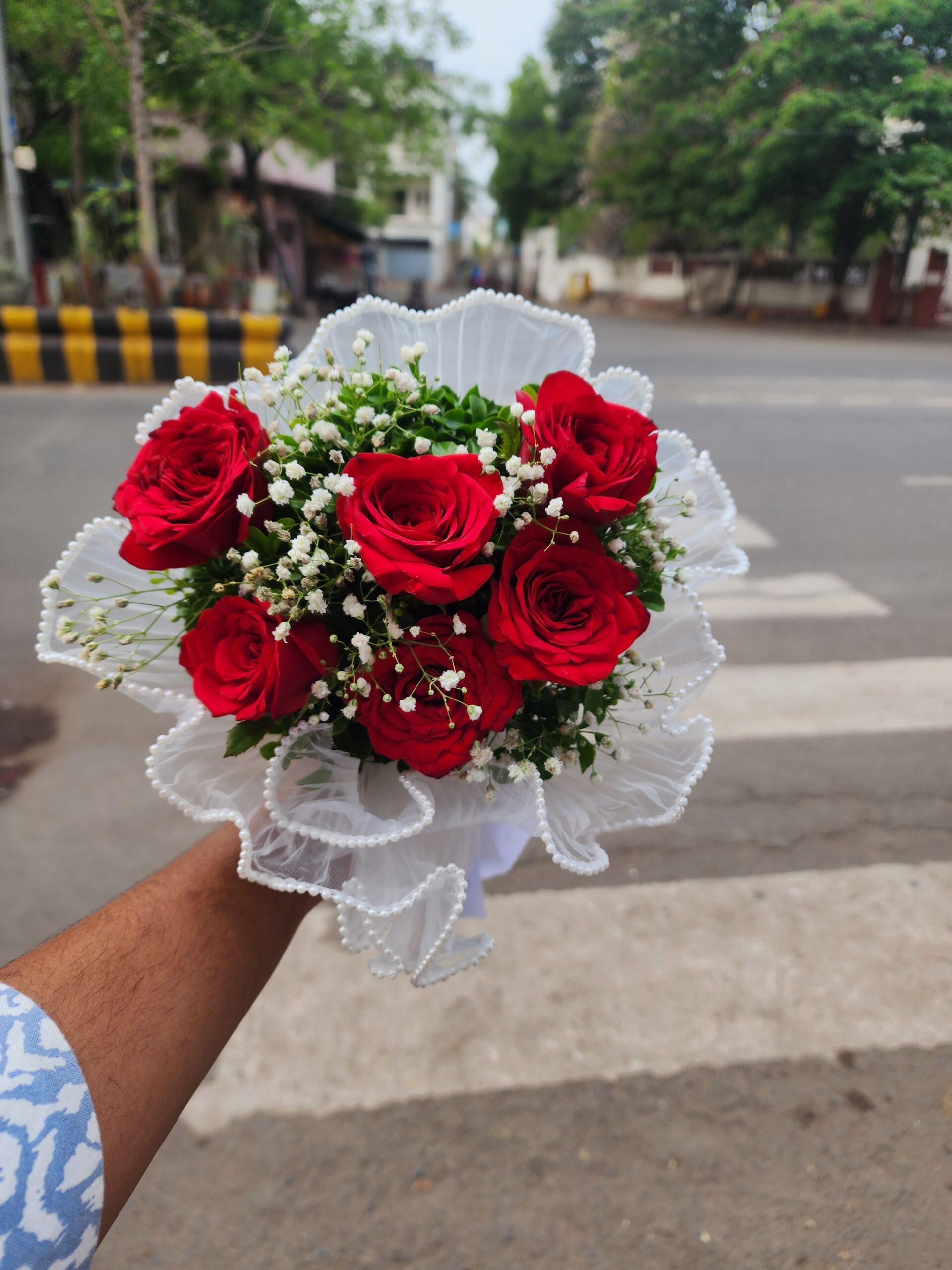red roses wrapped in white pearl net [mess]